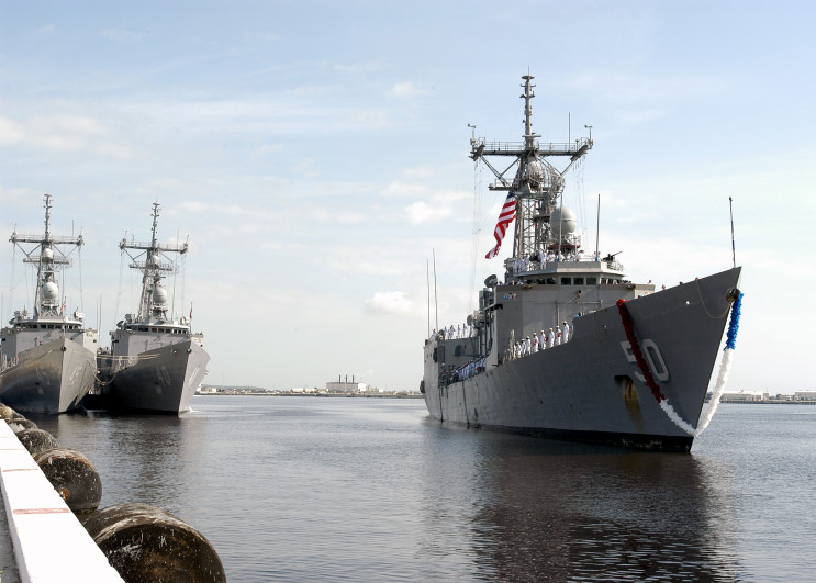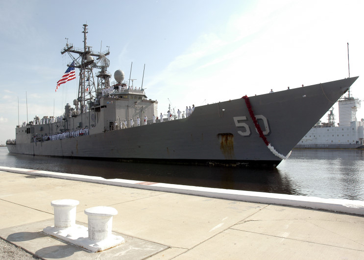 June 6, 2005: USS Taylor FFG-50 arriving at her homeport of Mayport, Florida after a seven month deployment in the Global War on Terrorism. Moored behind Taylor are the USS DeWert FFG-45 (left) and the