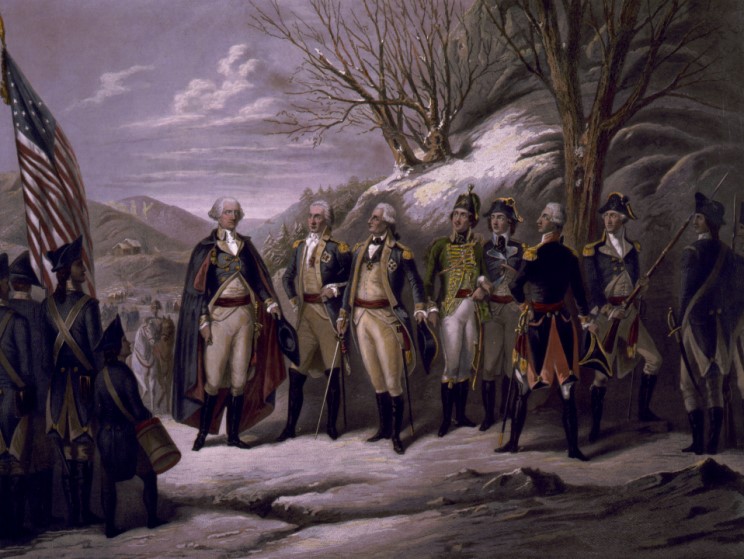 General George Washington standing with Johann De Kalb, Baron von Steuben, Kazimierz Pulaski, Tadeusz Kosciuszko, Lafayette, John Muhlenberg, and other officers during the Revolutionary War. |