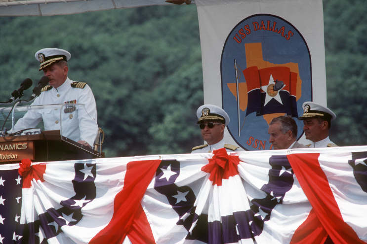 July 18, 1981: Captain Donald R. Ferrier, first commanding officer of Dallas SSN-770 speaking at the commissioning ceremony. |