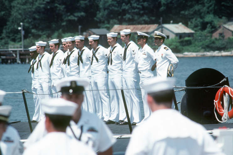 July 18, 1981: The boat is manned during the commissioning ceremony for USS Dallas SSN-770. |