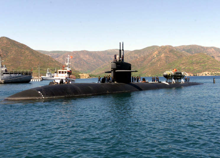 September 7, 2000: USS Dallas SSN-770 carrying Mystic DSRV-1 arriving at Aksaz Naval Base, Turkey during NATO exercise Sorbet Royal 2000, a