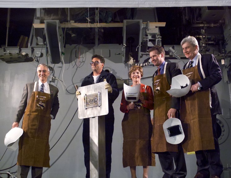 July 12, 2002: The Keel authentication ceremony for Texas SSN-775 at Northrop Grumman Newport News. From left to right; Secretary of the Navy Gordon England, Northrop Grumman Newport News welder John Fremont, First Lady Laura Bush, Northrop Grumman Newport News President Tom Schievelbein and Senator John Warner (R-Va.). |