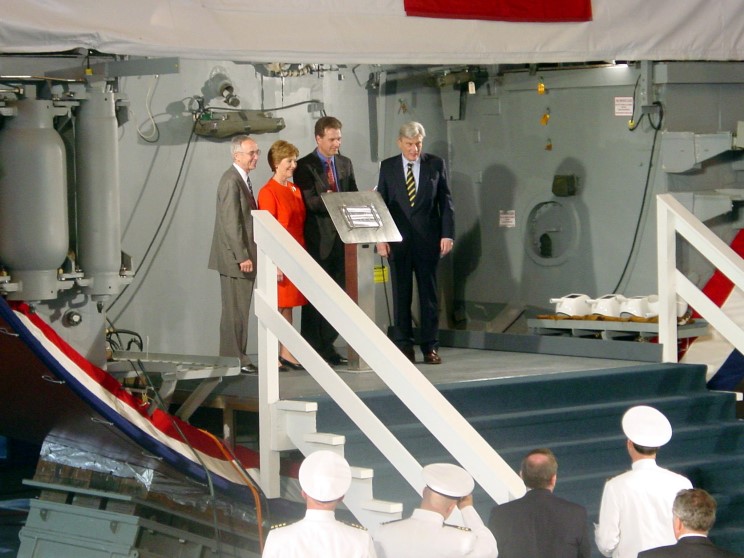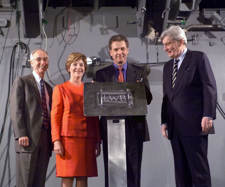 July 12, 2002: The Keel authentication ceremony for Texas SSN-775 at Northrop Grumman Newport News. From left to right; Secretary of the Navy Gordon England, First Lady Laura Bush, Northrop Grumman Newport News President Tom Schievelbein and Senator John Warner (R-Va.). |