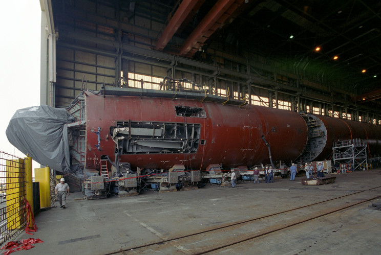 August 2003: The bow section is joined to the other completed hull sections of the Texas SSN-775. |