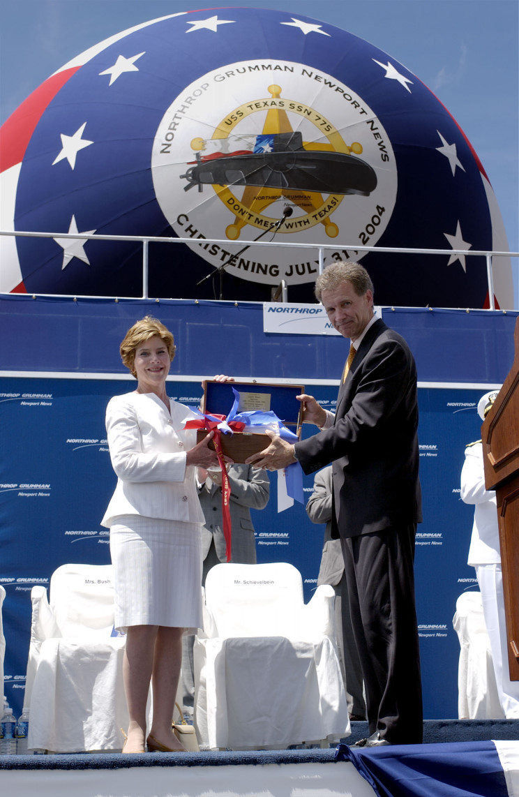 July 31, 2004: Tom Schievelbein, President of Northrop Grumman Newport News presents First Lady Laura Bush with the bottle she will use to christen the Texas. |