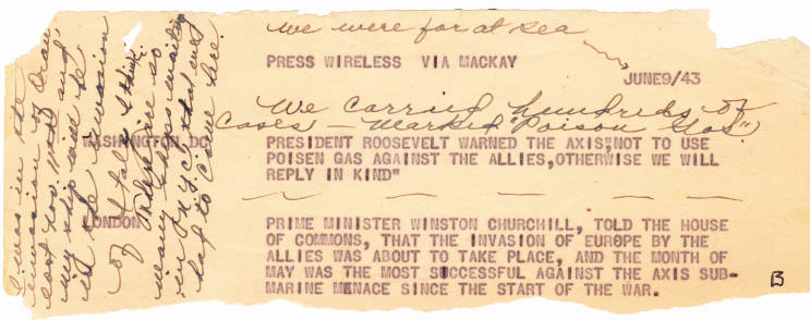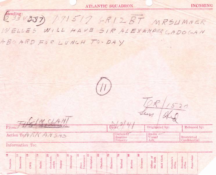 August 8, 1941: Signal announcing U.S. Under Secretary of State Sumner Wells will receive British diplomat Sir Alexander Cadogan onboard. |
