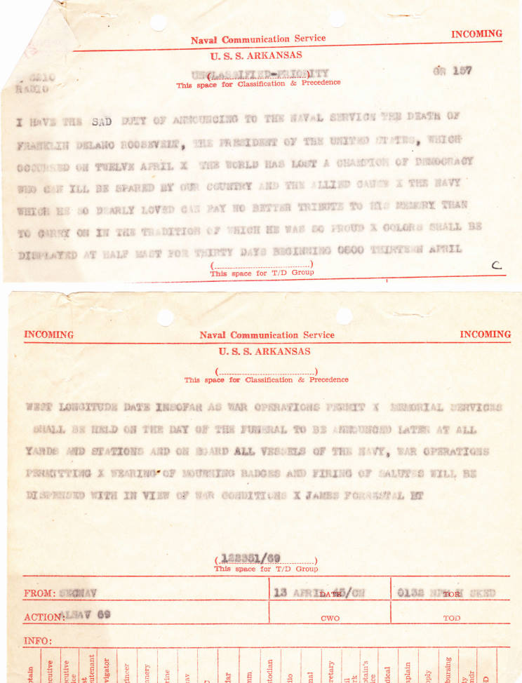 April 13, 1945: Announcement of President Roosevelt's death from the Secretary of the Navy. |