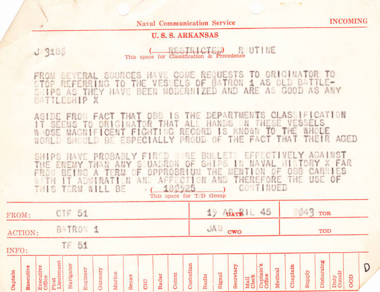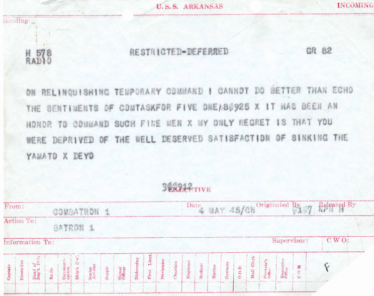 May 4, 1945: Message from Commander Battleship Squadron 1. |
