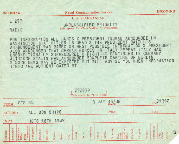 May 3, 1945: Announcement of Adolf Hitler's death. |