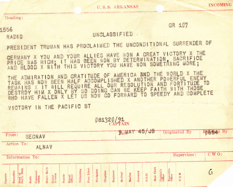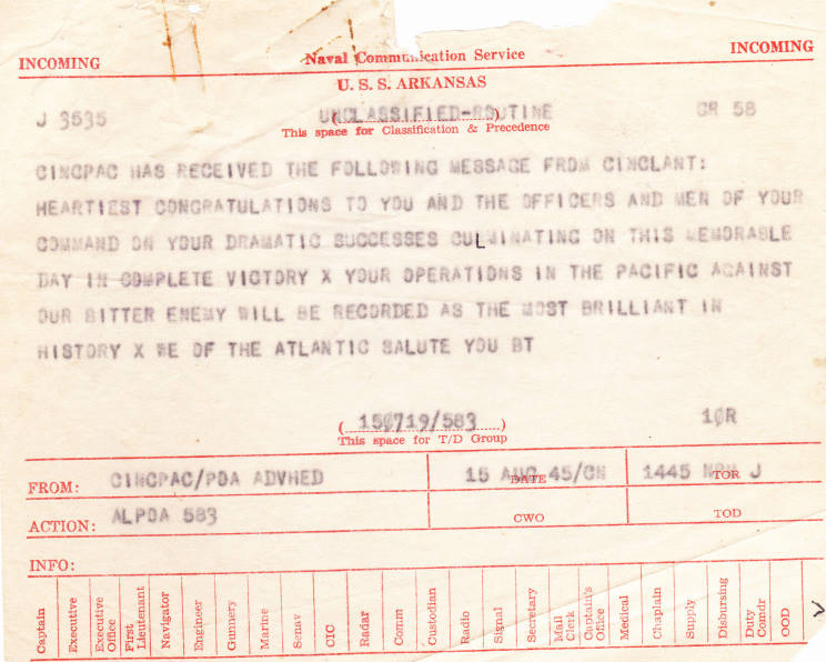 August 15, 1945 1445: Message from C-in-C Atlantic congratulating the U.S. Navy on the victory in the Pacific. |