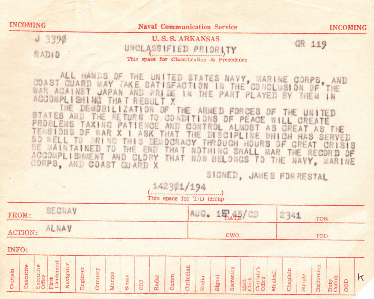 August 15, 1945 2341: Message from the Secretary of the Navy about the victory in the Pacific and the demobilization of U.S. forces. |