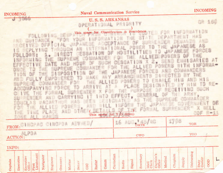 August 16, 1945: Message announcing the official surrender of the Imperial Japanese Empire. |
