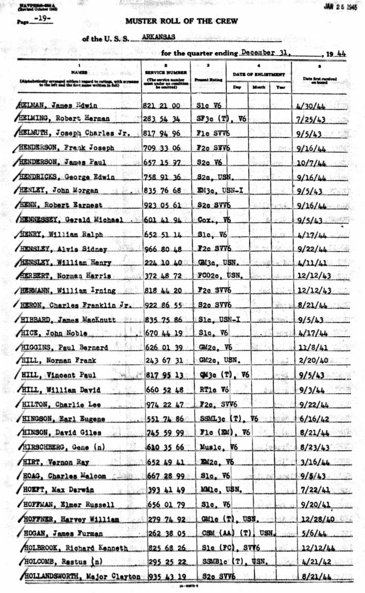 Page 19 of the Dec. 31, 1944 Muster Roll of USS Arkansas BB-33. |