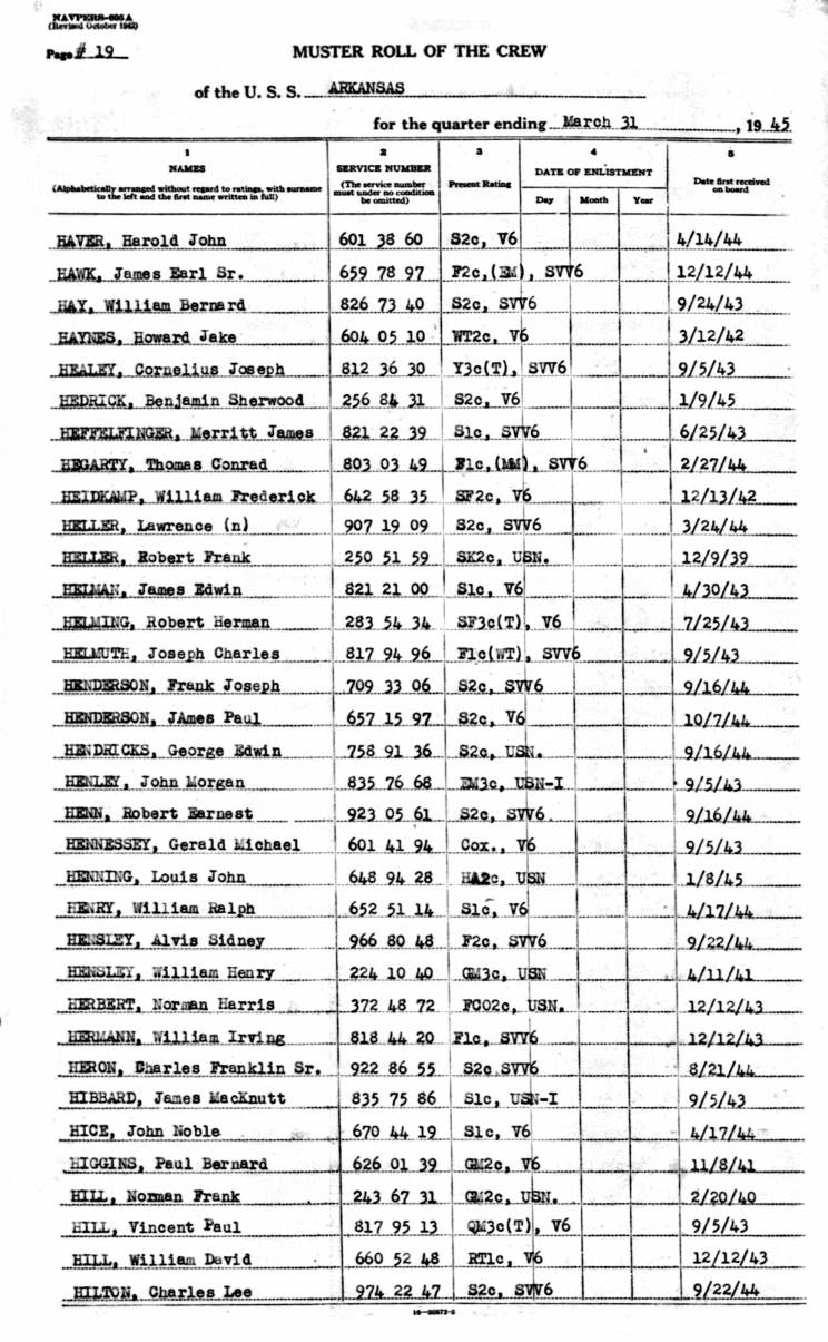 Page 19 of the March 31, 1945 Muster Roll of USS Arkansas BB-33. |