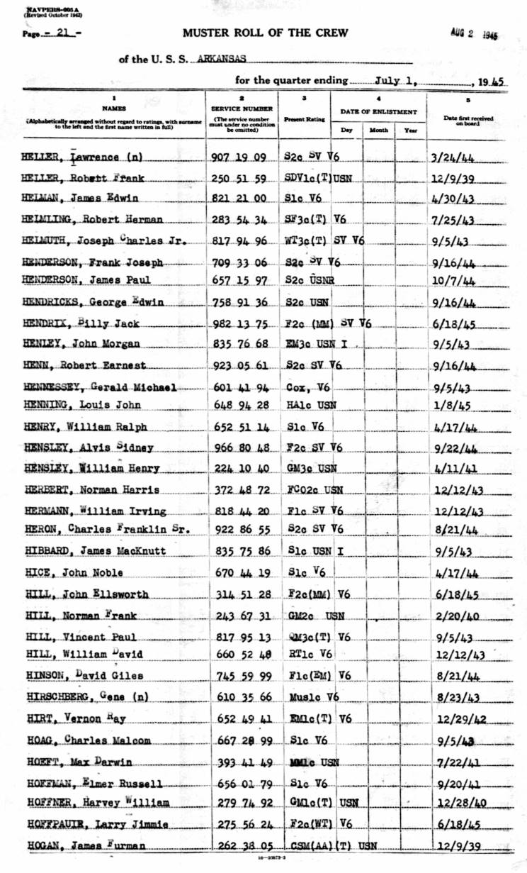 Page 21 of the July 1, 1945 Muster Roll of USS Arkansas BB-33. |