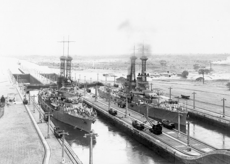 June 14, 1922: USS Delaware BB-28 and USS North Dakota BB-29 in the Panama Canal. |