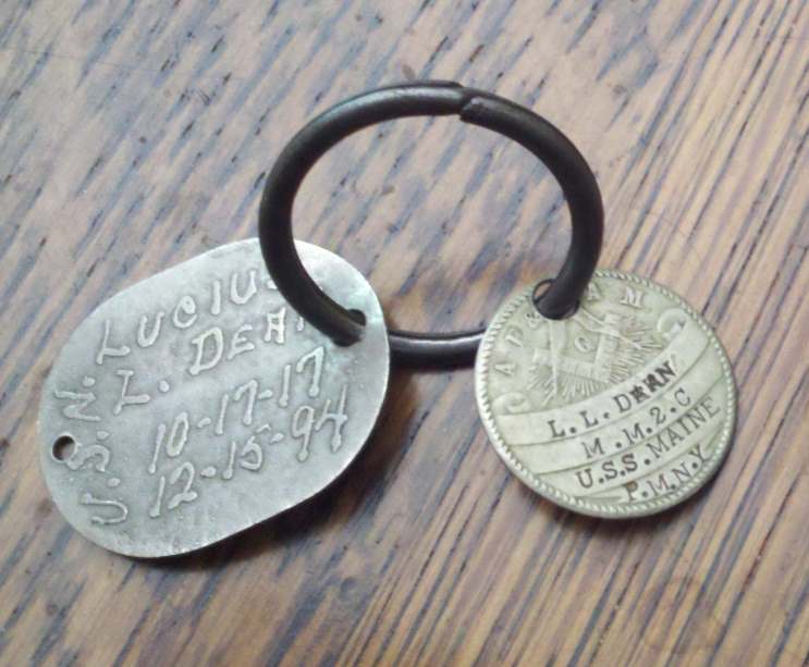 1. Aug. 27, 2011 My grandfather, Lucius L. Dean, Sr., was a Machinist Mate 2nd Class on the USS Maine BB-10 during WW1. We have a Masonic medal with his name, rank, ship's name and letters P.M.N.Y. along with a "dog tag" with USN, his name, date of birth and the date 10-17-17, which I think is his enlistment date. Tom Dean |