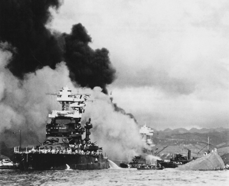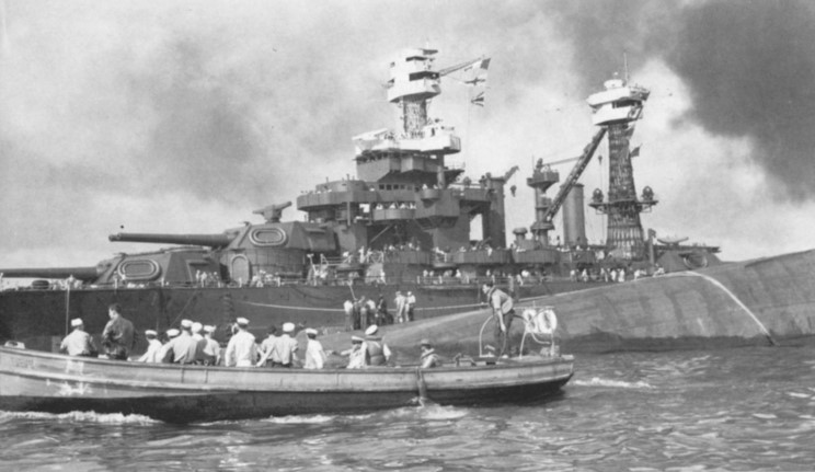 December 7, 1941: USS Maryland BB-46 and the capsized USS Oklahoma BB-37.