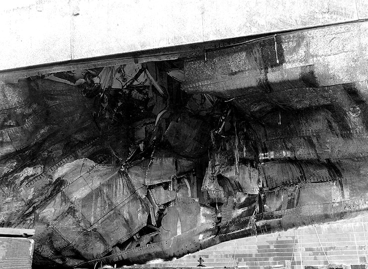 October 1, 1919: USS Minnesota at the Philadelphia Naval shipyard damaged after hitting a mine on Sept. 29, 1918 at position 38.11N - 74.41W. The mine, laid by SMS U-117 caused no casualties, but the ship was out of service until March of 1919. |