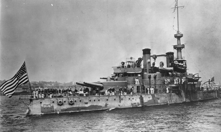 August 20, 1898: USS Oregon seen in the Naval Review in the Hudson River, New York City following duty in the Spanish-American War. |
