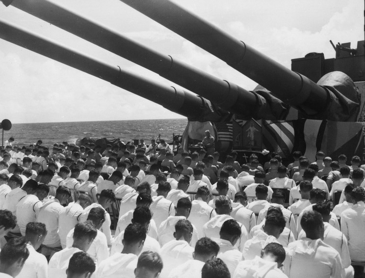 June 19, 1944: Crewmen of USS South Dakota BB-57 listen to Chaplain N. D. Lindner while he reads the benediction held in honor of fellow shipmates killed in the air action off Guam on June 19, 1944.