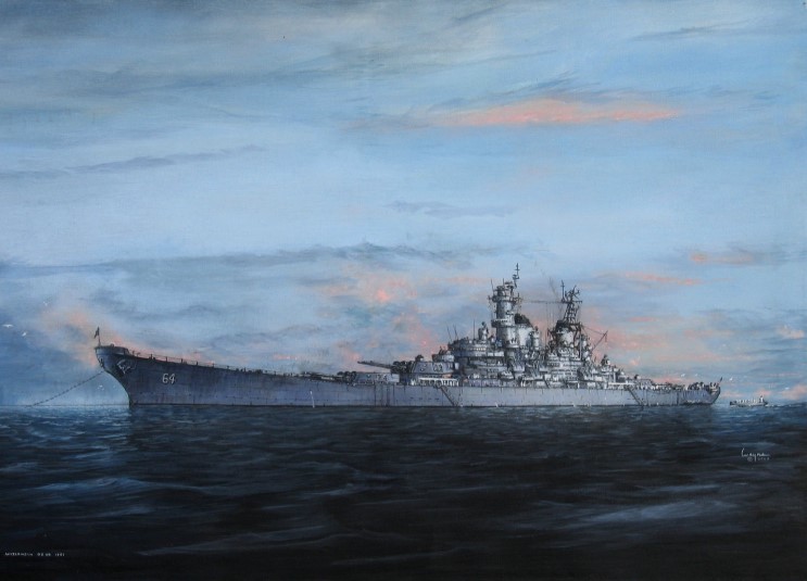 "Tropical Evening" portrait of the USS Wisconsin BB-64 in 1957 by Wayne Scarpaci. |