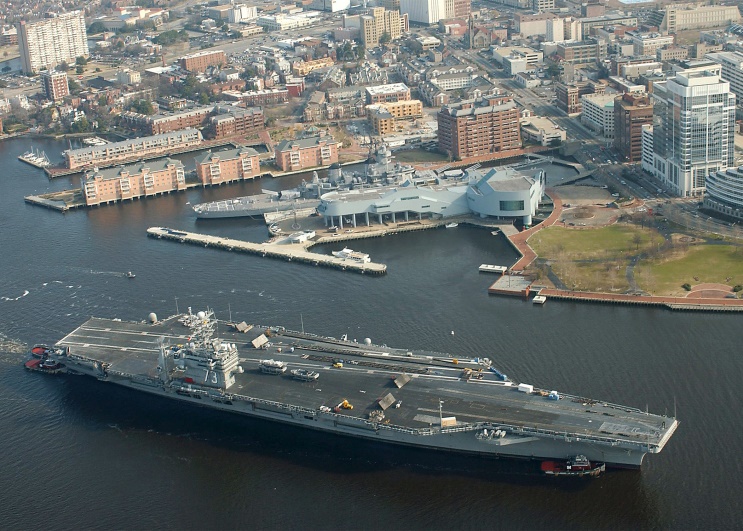 February 25, 2003: USS George Washington CVN-73 passes the Wisconsin BB-64 on the Elizabeth River,
