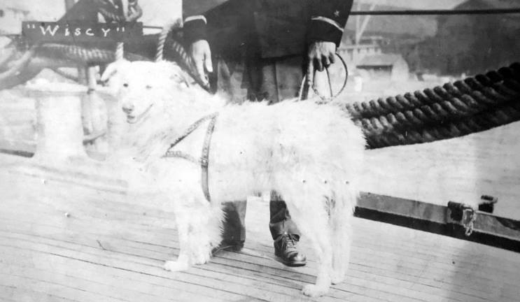 Postcard sent from USS Wisconsin, the reverse side reads "Thanksgiving Greetings, USS Wisconsin, Nov. 28, 1918." The photo shows a dog named Wiscy, which may have been the ships mascot. |