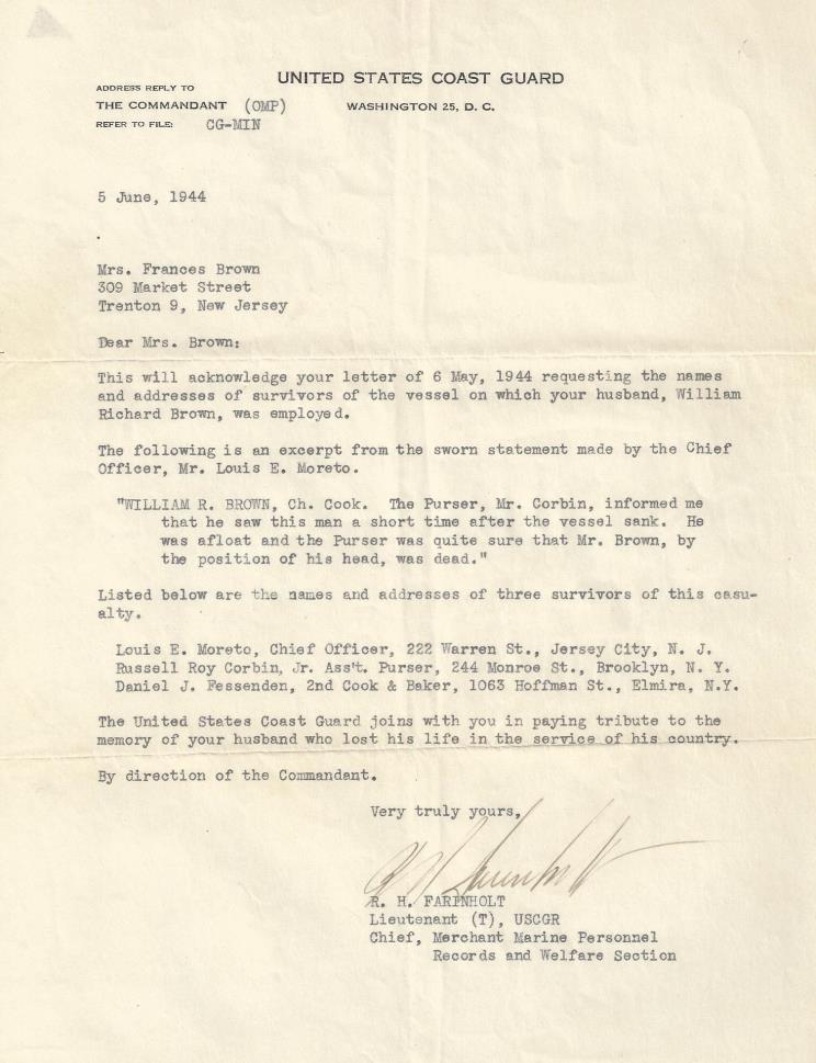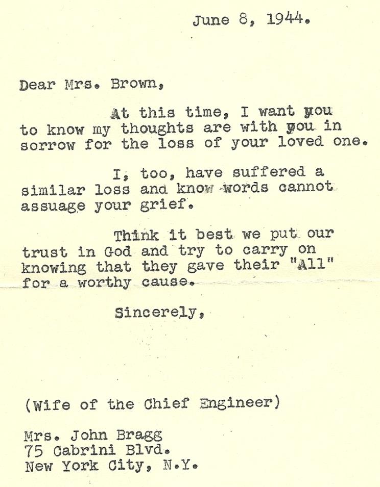 June 8, 1944 letter from Beatrice Bragg, wife of Chief Engineer John Bragg who was also lost in John A. Poor. |