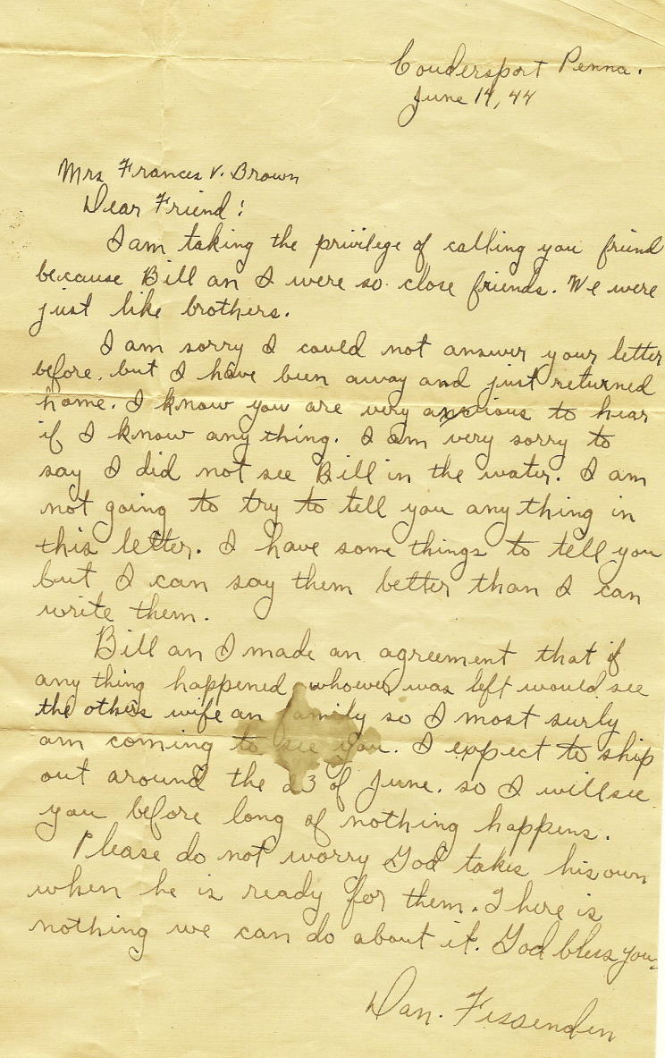 June 14, 1944 letter from 2nd Cook Daniel Fessenden, a survivor from John A. Poor. |
