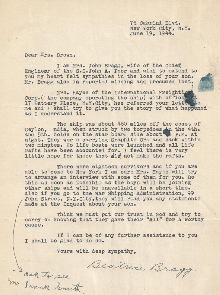 June 19, 1944 letter from Beatrice Bragg, wife of Chief Engineer John Bragg who was also lost in John A. Poor. |
