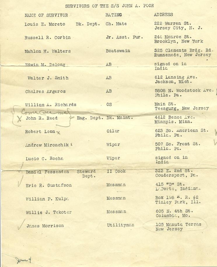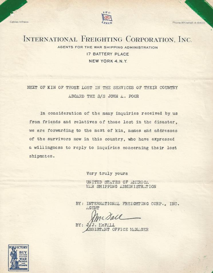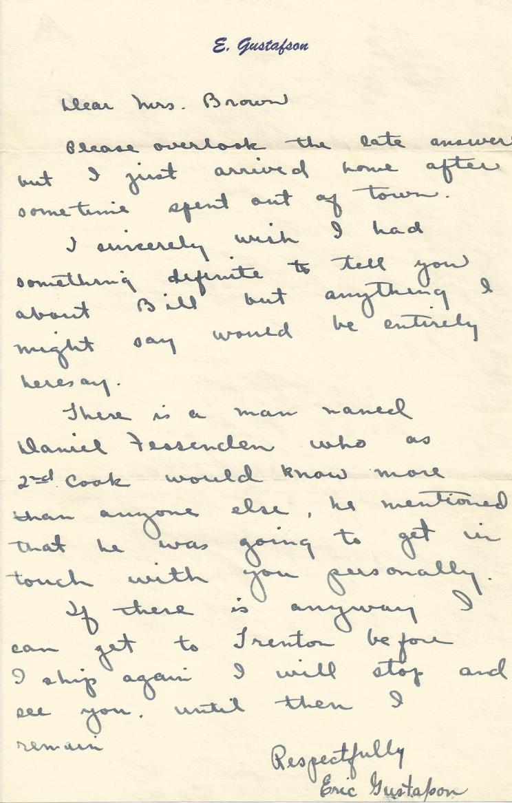 Letter from Messman Eric Gustafson, a survivor from John A. Poor. |