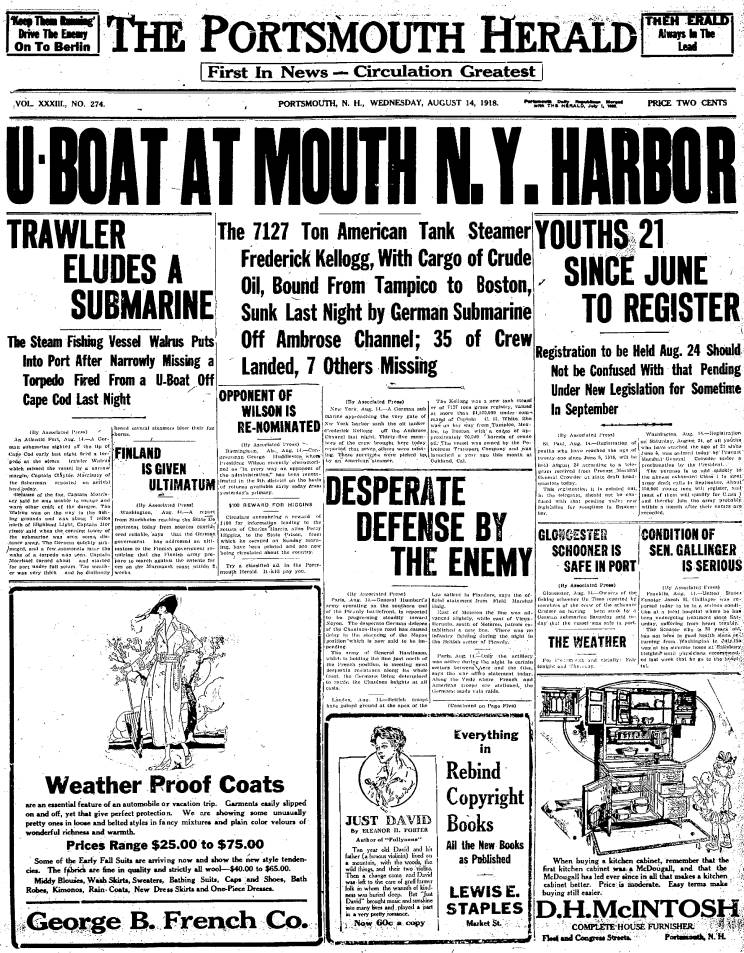 August 14, 1918: Front page of The Portsmouth Herald, Portsmouth, New Hampshire. |