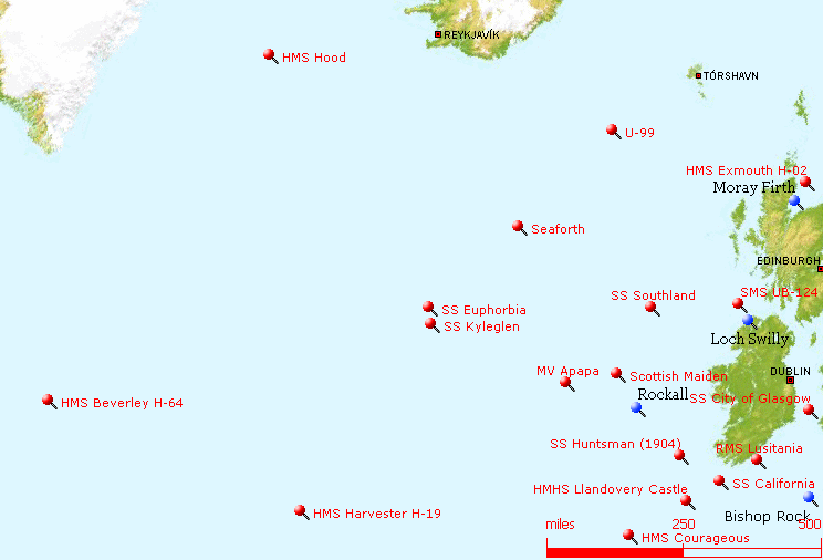 Location of the loss of SS Euphorbia (56.50N - 23.00W).