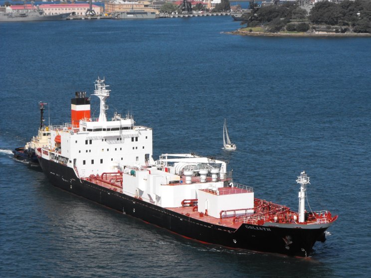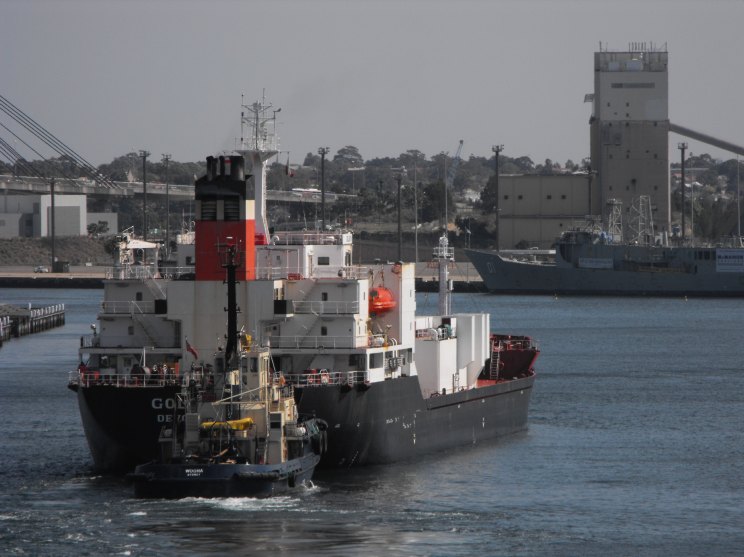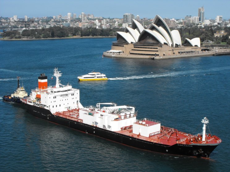 September 21, 2010: Goliath seen under escort of the tug Woona. HMAS Newcastle FFG-06 is seen at Garden Island in the background. |