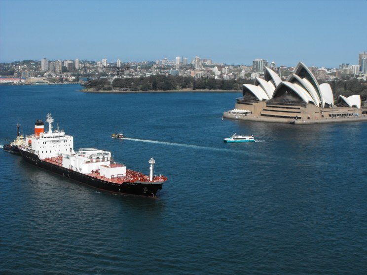 September 21, 2010: Goliath seen passing the Sydney Opera House under escort of the tug Woona. |