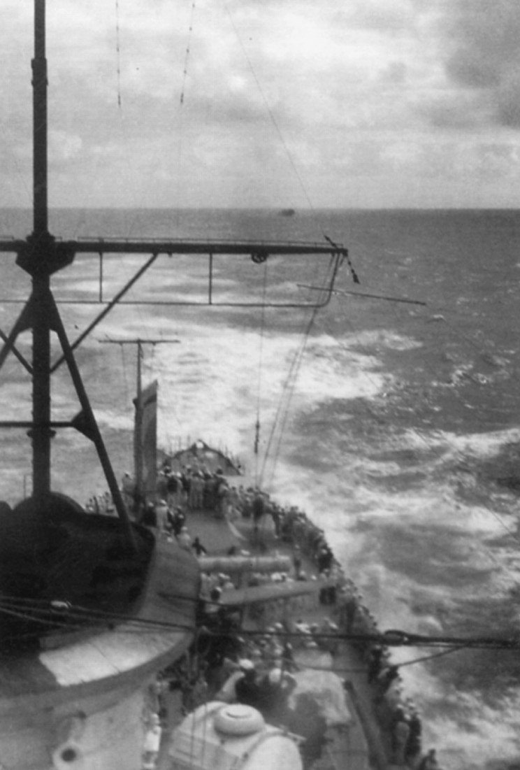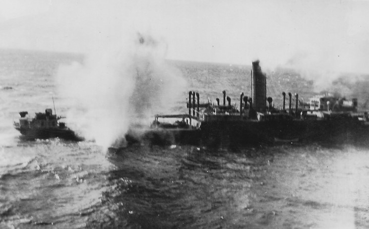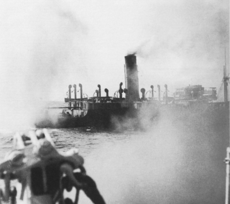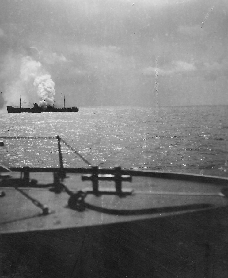 December 3, 1939: As the Admiral Graf Spee leaves the area the Tairoa can be seen about to sink.   |