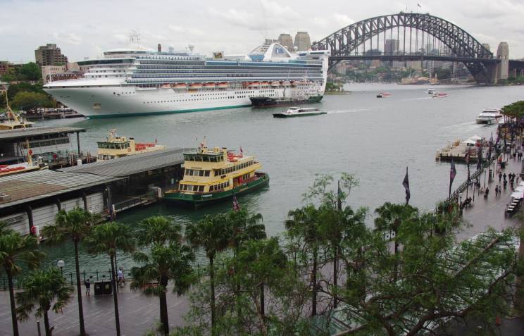 Overseas Passenger Terminal, Circular Quay, Sydney, NSW, Australia with the service vessel Destine alongside.The ferries Friendship and Golden Grove are seen docked in the foreground. |