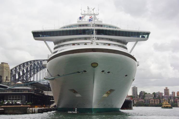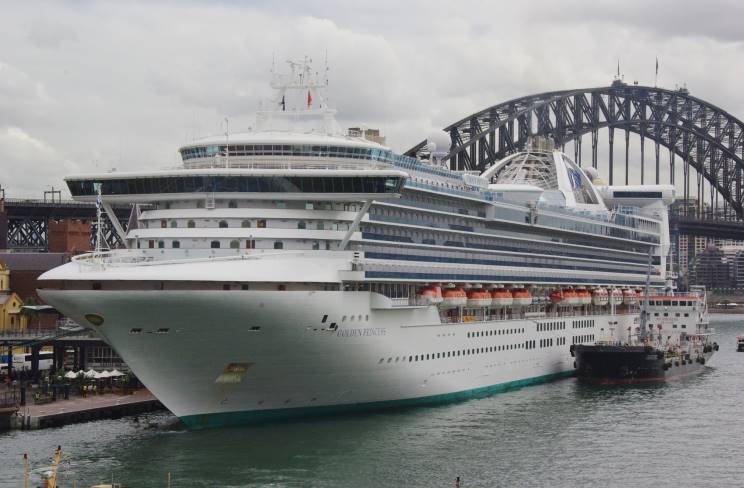 October 28, 2015: Golden Princess seen at the Overseas Passenger Terminal, Circular Quay, Sydney, NSW, Australia with the service vessel Destine alongside. The Harbour Bridge can be seen in the background. |