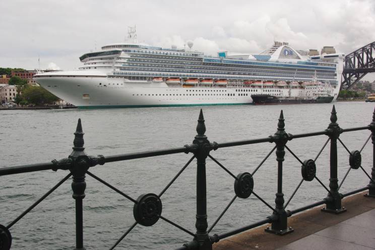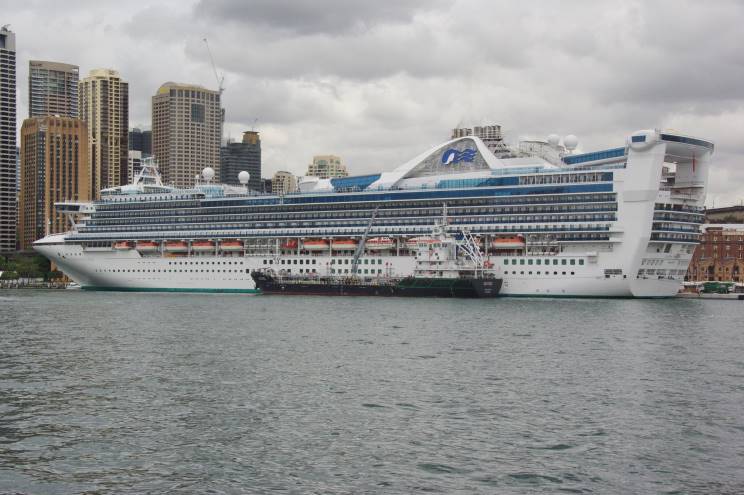 October 28, 2015: Golden Princess seen at the Overseas Passenger Terminal, Circular Quay, Sydney, NSW, Australia with the service vessel Destine alongside. |