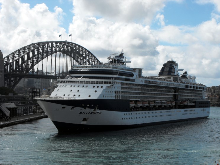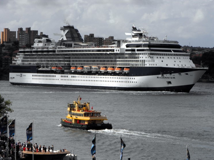 March 30, 2009: Millennium using her azimuthing pods and bow thrusters to move away from the Circular Quay, Sydney, Australia. The harbour ship Supply is seen in the foreground. |
