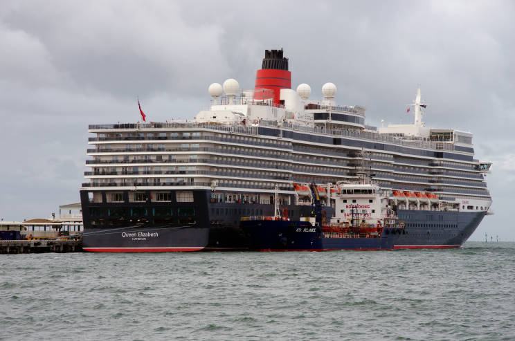 March 12, 2019: Queen Elizabeth seen at Station Pier, Port Melbourne, VIC, Australia. ICS Reliance is seen alongside. |