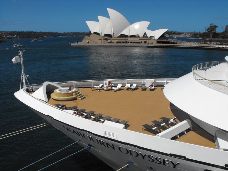 February 25, 2010: The bow of Seabourn Odyssey with the Sydney Opera House seen in the background. |