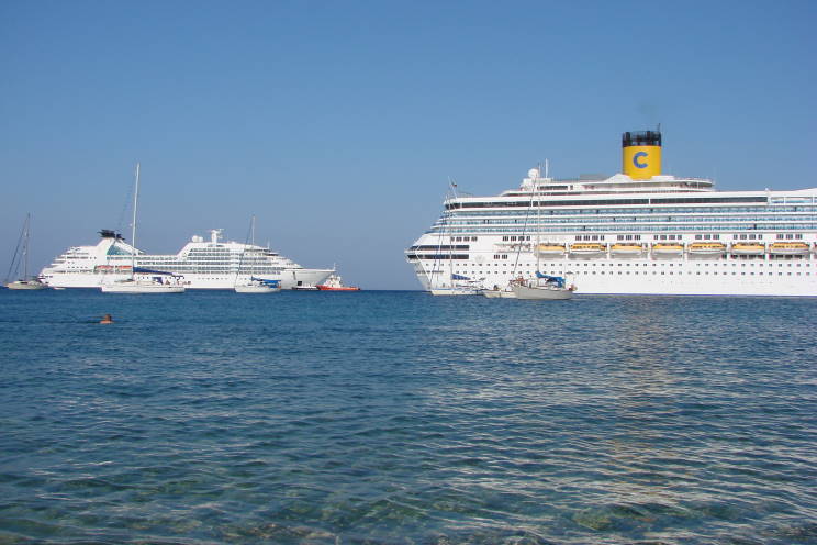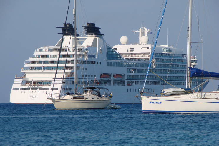 September 9, 2011: Seabourn Odyssey seen departing Rhodes, Greece. Costa Fortuna is seen in the foreground. |