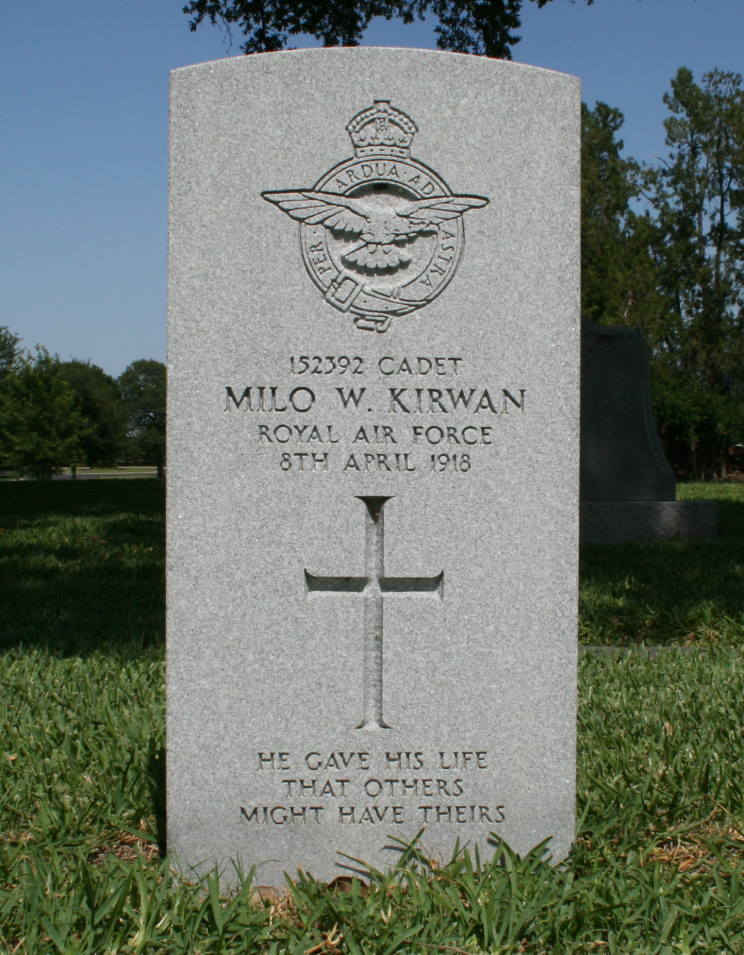 8. Cadet Milo William Kirwan, R.A.F., died Apr. 18, 1918. (The Royal Flying Corps was merged with the Royal Naval Air Service on Apr. 1, 1918 and became the Royal Air Force.) |