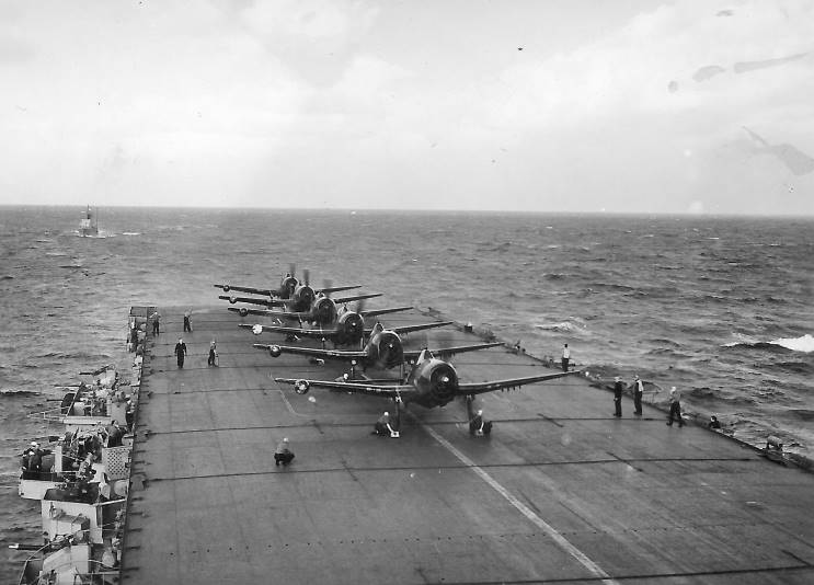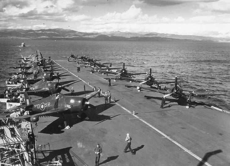 October 1945: Grumman Martlets seen on the flight deck of HMS Ocean during flight training off the Isle of Bute, Scotland. HMS Maynell L-82 is seen in the background. |