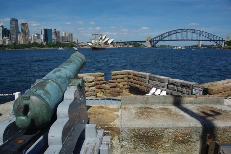 January 7, 2012: A cannon at Fort Denison in the foreground and James Craig passing the Sydney Opera House in the background. |