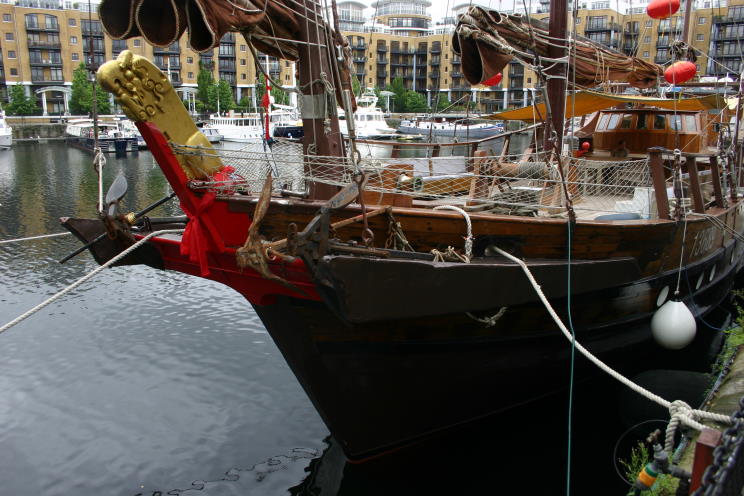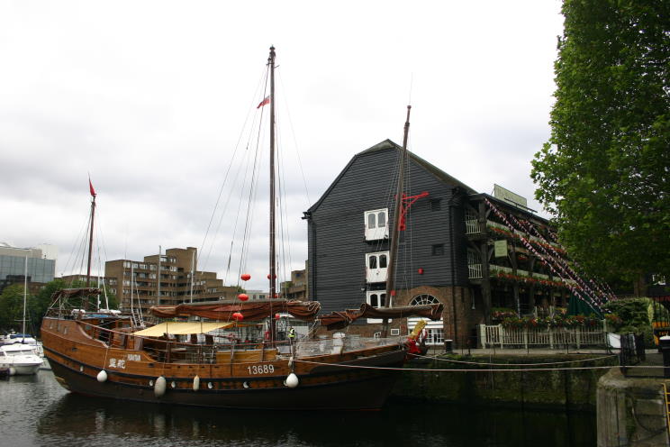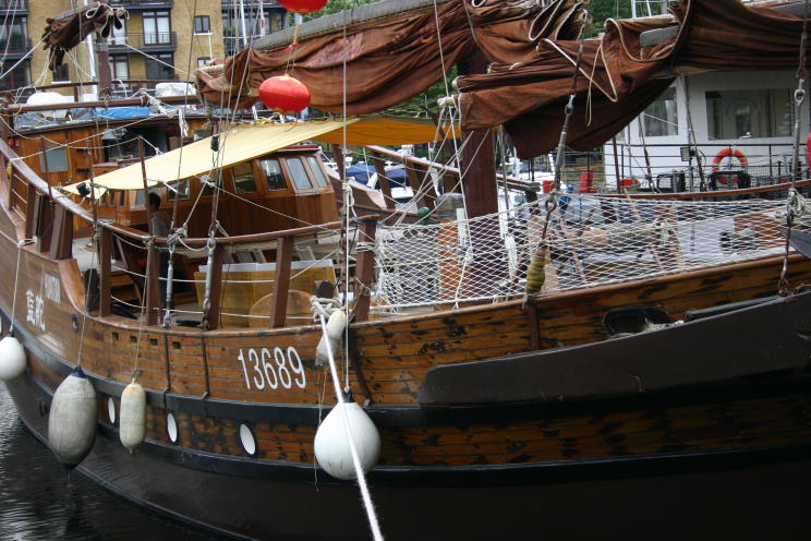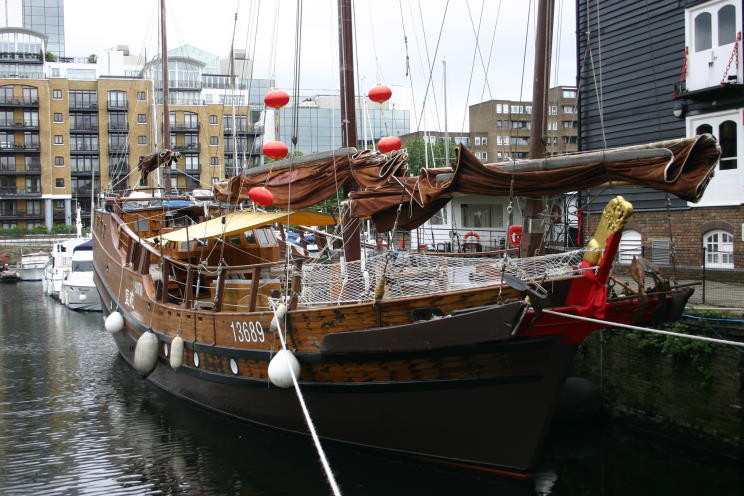 July 18, 2012: Huantian seen at St. Catherine's Dock, London, England during the 2012 Summer Olympics. Huantian is a typical Hong Kong Chinese trading junk that have been sailing the seas in this design for thousands of years. She is only the second vessel of this type to ever have visited Britain the last was in 1851. She was built in 1973 draft of 3.9m and a height of 28m. Her sails are 360 directional which enable her to sail in any direction! Her history is quite interesting. She started out life as a routine coaster, but was acquired by the Hong Kong Jockey club to provide and encourage youngsters learning about traditional Chinese sailing history and experience the realities. She was subsequently used for public relations, tourism and entertainment around Hong Kong. A couple of years ago she was purchased and refurbished by VSV (CHINA) Yacht Ltd. to enable her to be part of the Queen's Jubilee pageant and the Olympic celebrations etc. The prime mover for this was Hua Shan and his British wife Sarah Noble the parents of Hua Tian the Chinese Olympic Equestrian. |