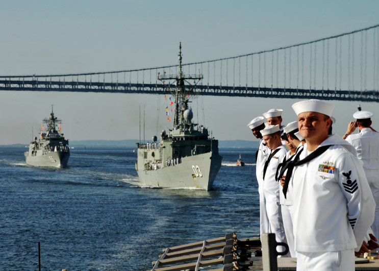 July 19, 2009: HMAS Sydney FFG-03 and HMAS Ballarat FFH-155 seen arriving at New York for a port visit. |