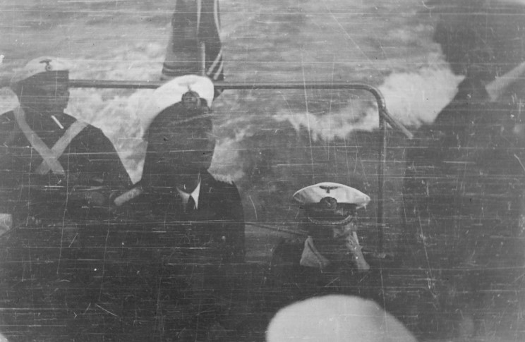 December 17, 1939: The scene in the motor launch just minuets before the explosion. Kapitän zur See Hans W. Langsdorff, seated and looking despondent and Fregattenkapitän Paul Ascher (standing center), have just left the Admiral Graf Spee after setting the scuttling charges. |
